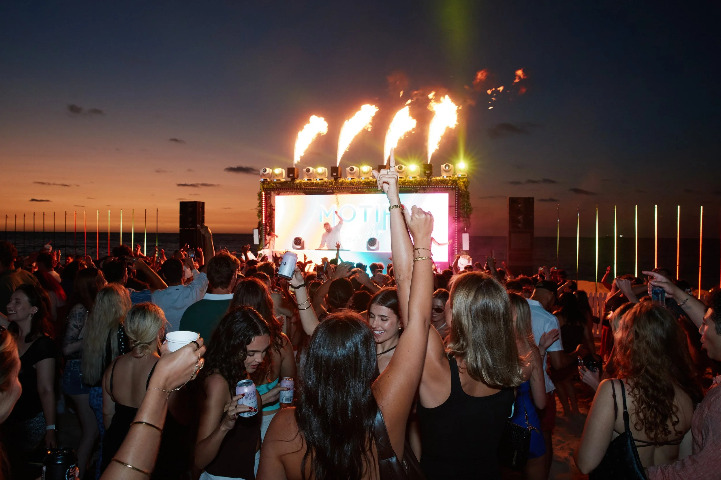Crowd at a concert or music festival at night with a stage, colorful lights, and smoke effects.
